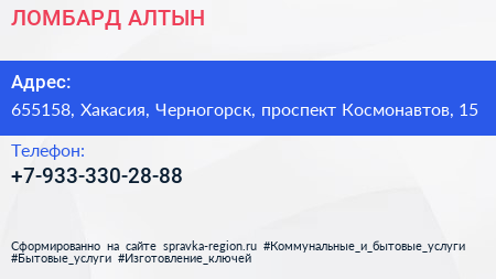 ЛОМБАРД АЛТЫН по адресу 655158, Хакасия, Черногорск, проспект Космонавтов, 15 в дальнейшем Организация, размещена в следующих категориях: