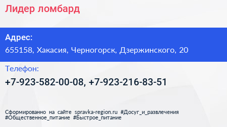 Лидер, ломбард по адресу 655158, Хакасия, Черногорск, Дзержинского, 20 в дальнейшем Организация, размещена в следующих категориях: