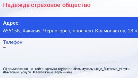 Надежда, страховое общество по адресу 655158, Хакасия, Черногорск, проспект Космонавтов, 18 к1 в дальнейшем Организация, размещена в следующих категориях: