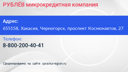 РУБЛЁВ, микрокредитная компания по адресу 655158, Хакасия, Черногорск, проспект Космонавтов, 27 в дальнейшем Организация, размещена в следующих категориях: