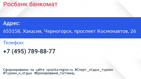 Росбанк, банкомат по адресу 655158, Хакасия, Черногорск, проспект Космонавтов, 26 в дальнейшем Организация, размещена в следующих категориях: