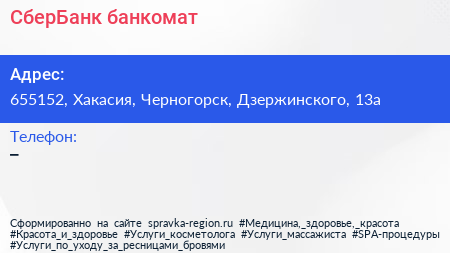 СберБанк, банкомат по адресу 655152, Хакасия, Черногорск, Дзержинского, 13а в дальнейшем Организация, размещена в следующих категориях: