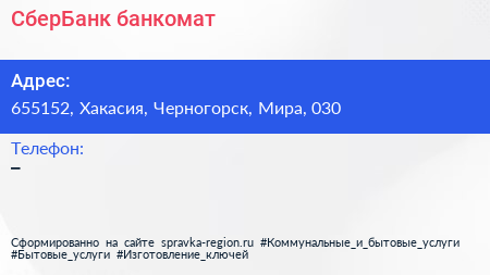 СберБанк, банкомат по адресу 655152, Хакасия, Черногорск, Мира, 030 в дальнейшем Организация, размещена в следующих категориях: