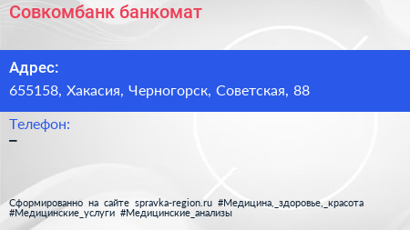 Совкомбанк, банкомат по адресу 655158, Хакасия, Черногорск, Советская, 88 в дальнейшем Организация, размещена в следующих категориях:
