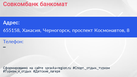 Совкомбанк, банкомат по адресу 655158, Хакасия, Черногорск, проспект Космонавтов, 8 в дальнейшем Организация, размещена в следующих категориях: