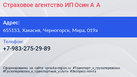 Страховое агентство, ИП Осин А.А. по адресу 655153, Хакасия, Черногорск, Мира, 019а в дальнейшем Организация, размещена в следующих категориях: