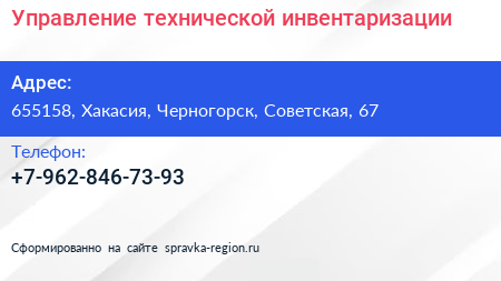 Управление технической инвентаризации по адресу 655158, Хакасия, Черногорск, Советская, 67 в дальнейшем Организация, размещена в следующих категориях: