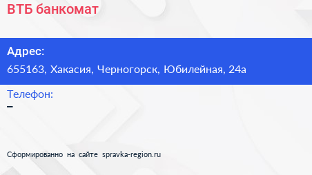 ВТБ, банкомат по адресу 655163, Хакасия, Черногорск, Юбилейная, 24а в дальнейшем Организация, размещена в следующих категориях: