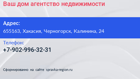 Ваш дом, агентство недвижимости по адресу 655163, Хакасия, Черногорск, Калинина, 24 в дальнейшем Организация, размещена в следующих категориях: