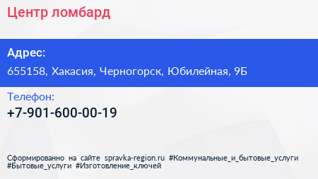 Центр, ломбард по адресу 655158, Хакасия, Черногорск, Юбилейная, 9Б в дальнейшем Организация, размещена в следующих категориях: