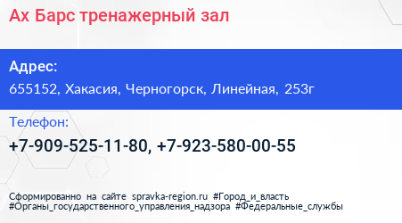 Ах Барс, тренажерный зал по адресу 655152, Хакасия, Черногорск, Линейная, 253г в дальнейшем Организация, размещена в следующих категориях: