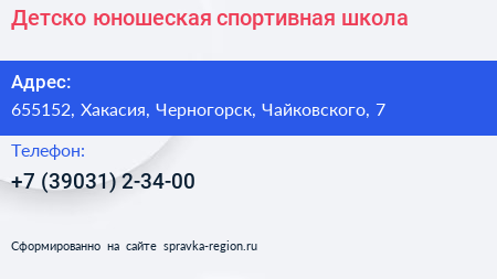 Детско-юношеская спортивная школа по адресу 655152, Хакасия, Черногорск, Чайковского, 7 в дальнейшем Организация, размещена в следующих категориях: