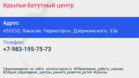 Крылья, батутный центр по адресу 655152, Хакасия, Черногорск, Дзержинского, 13а в дальнейшем Организация, размещена в следующих категориях: