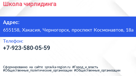 Школа чирлидинга по адресу 655158, Хакасия, Черногорск, проспект Космонавтов, 18а в дальнейшем Организация, размещена в следующих категориях: