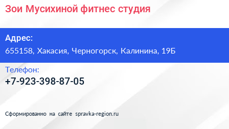 Зои Мусихиной, фитнес-студия по адресу 655158, Хакасия, Черногорск, Калинина, 19Б в дальнейшем Организация, размещена в следующих категориях: