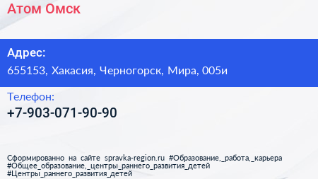Атом-Омск по адресу 655153, Хакасия, Черногорск, Мира, 005и в дальнейшем Организация, размещена в следующих категориях: