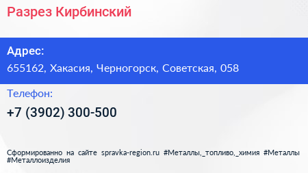 Разрез Кирбинский по адресу 655162, Хакасия, Черногорск, Советская, 058 в дальнейшем Организация, размещена в следующих категориях: