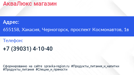АкваЛюкс, магазин по адресу 655158, Хакасия, Черногорск, проспект Космонавтов, 1в в дальнейшем Организация, размещена в следующих категориях: