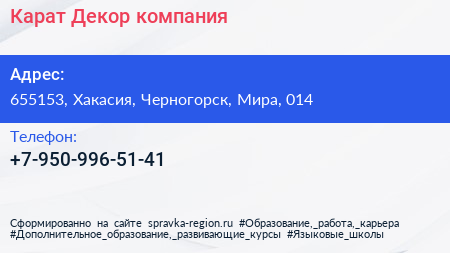 Карат Декор, компания по адресу 655153, Хакасия, Черногорск, Мира, 014 в дальнейшем Организация, размещена в следующих категориях: