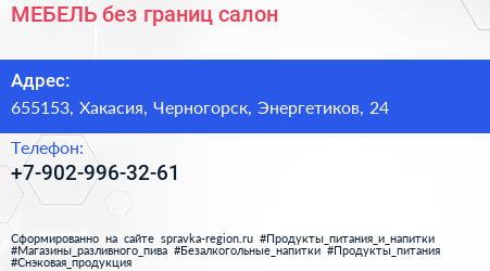 МЕБЕЛЬ без границ, салон по адресу 655153, Хакасия, Черногорск, Энергетиков, 24 в дальнейшем Организация, размещена в следующих категориях:
