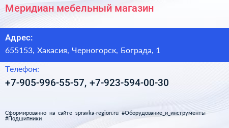 Меридиан, мебельный магазин по адресу 655153, Хакасия, Черногорск, Бограда, 1 в дальнейшем Организация, размещена в следующих категориях: