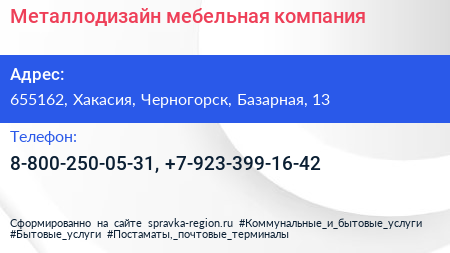 Металлодизайн, мебельная компания по адресу 655162, Хакасия, Черногорск, Базарная, 13 в дальнейшем Организация, размещена в следующих категориях: