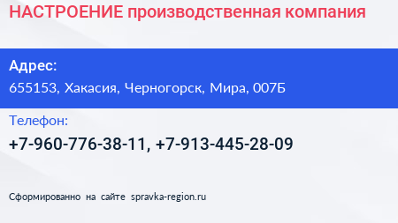 НАСТРОЕНИЕ, производственная компания по адресу 655153, Хакасия, Черногорск, Мира, 007Б в дальнейшем Организация, размещена в следующих категориях: