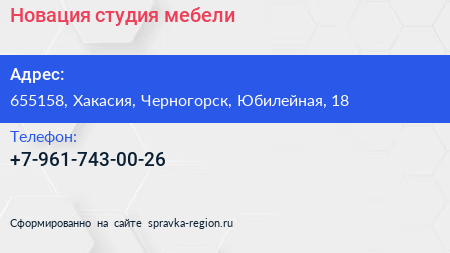 Новация, студия мебели по адресу 655158, Хакасия, Черногорск, Юбилейная, 18 в дальнейшем Организация, размещена в следующих категориях:
