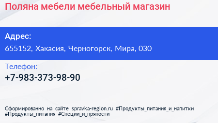 Поляна мебели, мебельный магазин по адресу 655152, Хакасия, Черногорск, Мира, 030 в дальнейшем Организация, размещена в следующих категориях: