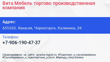 Вита-Мебель, торгово-производственная компания по адресу 655163, Хакасия, Черногорск, Калинина, 24 в дальнейшем Организация, размещена в следующих категориях: