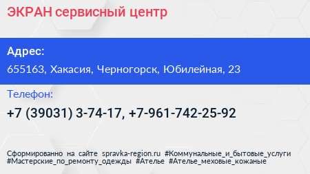 ЭКРАН, сервисный центр по адресу 655163, Хакасия, Черногорск, Юбилейная, 23 в дальнейшем Организация, размещена в следующих категориях: