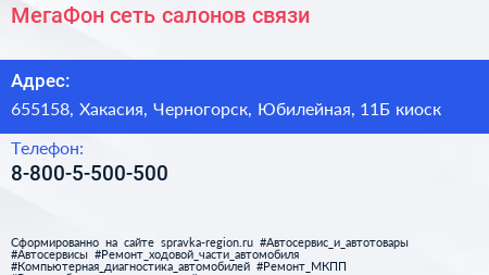 МегаФон, сеть салонов связи по адресу 655158, Хакасия, Черногорск, Юбилейная, 11Б киоск в дальнейшем Организация, размещена в следующих категориях: