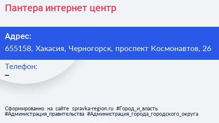 Пантера, интернет-центр по адресу 655158, Хакасия, Черногорск, проспект Космонавтов, 26 в дальнейшем Организация, размещена в следующих категориях: