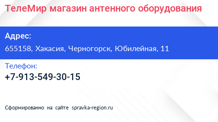 ТелеМир, магазин антенного оборудования по адресу 655158, Хакасия, Черногорск, Юбилейная, 11 в дальнейшем Организация, размещена в следующих категориях: