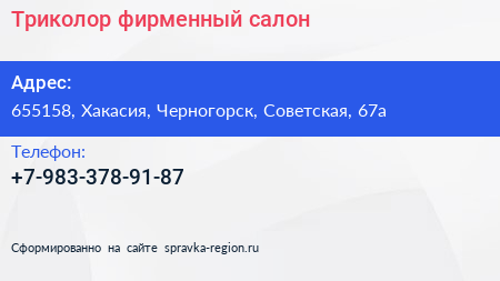 Триколор, фирменный салон по адресу 655158, Хакасия, Черногорск, Советская, 67а в дальнейшем Организация, размещена в следующих категориях: