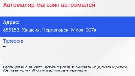 Автомаляр, магазин автоэмалей по адресу 655153, Хакасия, Черногорск, Мира, 007а в дальнейшем Организация, размещена в следующих категориях:
