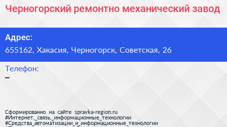 Черногорский ремонтно-механический завод по адресу 655162, Хакасия, Черногорск, Советская, 26 в дальнейшем Организация, размещена в следующих категориях: