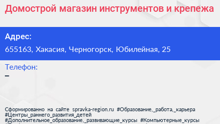 Домострой, магазин инструментов и крепежа по адресу 655163, Хакасия, Черногорск, Юбилейная, 25 в дальнейшем Организация, размещена в следующих категориях: