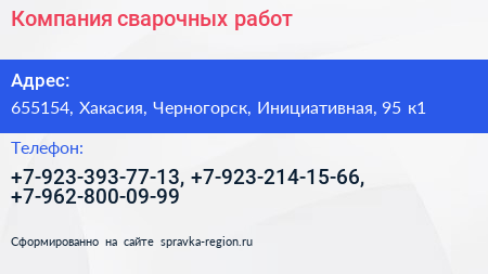 Компания сварочных работ по адресу 655154, Хакасия, Черногорск, Инициативная, 95 к1 в дальнейшем Организация, размещена в следующих категориях: