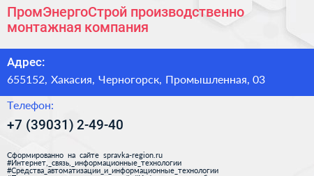 ПромЭнергоСтрой, производственно-монтажная компания по адресу 655152, Хакасия, Черногорск, Промышленная, 03 в дальнейшем Организация, размещена в следующих категориях: