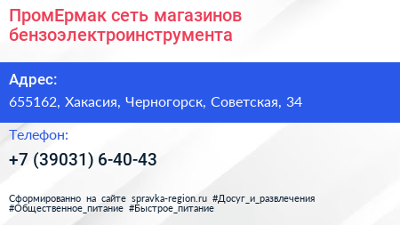 ПромЕрмак, сеть магазинов бензоэлектроинструмента по адресу 655162, Хакасия, Черногорск, Советская, 34 в дальнейшем Организация, размещена в следующих категориях: