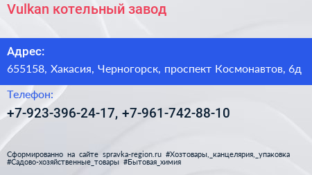 Vulkan, котельный завод по адресу 655158, Хакасия, Черногорск, проспект Космонавтов, 6д в дальнейшем Организация, размещена в следующих категориях: