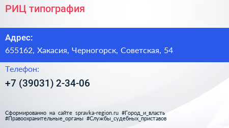 РИЦ, типография по адресу 655162, Хакасия, Черногорск, Советская, 54 в дальнейшем Организация, размещена в следующих категориях: