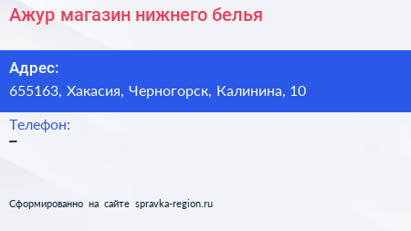 Ажур, магазин нижнего белья по адресу 655163, Хакасия, Черногорск, Калинина, 10 в дальнейшем Организация, размещена в следующих категориях: