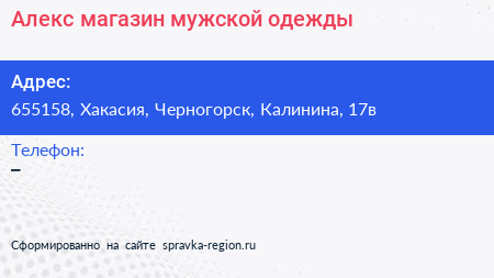 Алекс, магазин мужской одежды по адресу 655158, Хакасия, Черногорск, Калинина, 17в в дальнейшем Организация, размещена в следующих категориях: