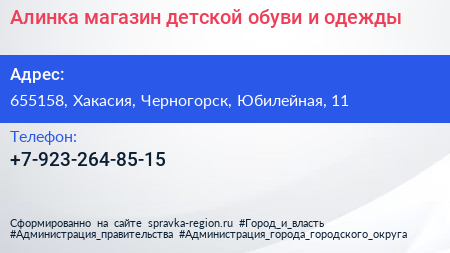 Алинка, магазин детской обуви и одежды по адресу 655158, Хакасия, Черногорск, Юбилейная, 11 в дальнейшем Организация, размещена в следующих категориях: