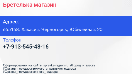 Бретелька, магазин по адресу 655158, Хакасия, Черногорск, Юбилейная, 20 в дальнейшем Организация, размещена в следующих категориях: