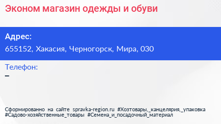 Эконом, магазин одежды и обуви по адресу 655152, Хакасия, Черногорск, Мира, 030 в дальнейшем Организация, размещена в следующих категориях:
