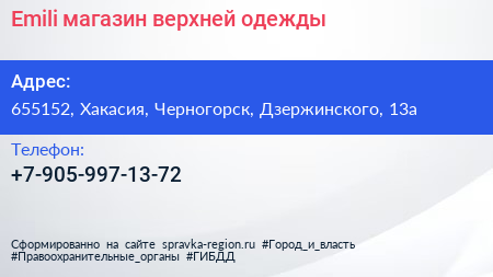 Emili, магазин верхней одежды по адресу 655152, Хакасия, Черногорск, Дзержинского, 13а в дальнейшем Организация, размещена в следующих категориях: