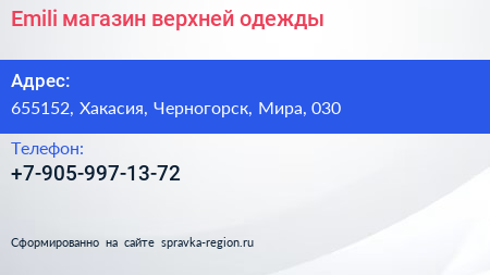 Emili, магазин верхней одежды по адресу 655152, Хакасия, Черногорск, Мира, 030 в дальнейшем Организация, размещена в следующих категориях: